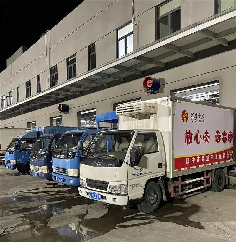 凌晨2點,當所有人都在睡夢中的時候,江蘇富康食品有限公司的發貨大廳燈火通明,一輛又一輛冷鏈運輸車空車駛入,很快,又一輛一輛的滿載了豬肉出來。